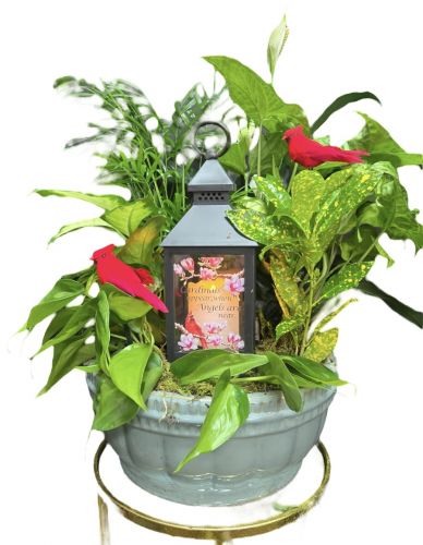 A indoor garden with cardinals and a charming keepsake lantern is a lovely way to express your sympathy