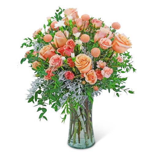 Our Glazed Honeycrisp design is a sweet way to show someone you care. Delicate peach roses bring life to this arrangement, as Carnations, Crespedia, and other premium flowers and foliage fill it out beautifully. If you’re looking for a birthday or anniversary gift that really expresses your love, look no further than our Glazed Honeycrisp design. We can offer same-day flower delivery in most cases.