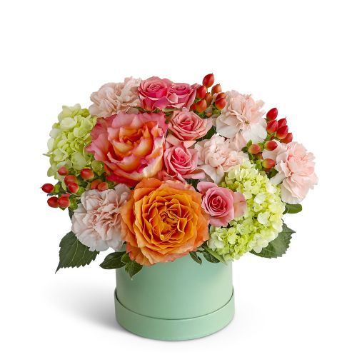 Her Legacy Garden is a soft, graceful blend of peach roses, carnations, hydrangea, and hypericum berries tucked into a vintage hatbox with premium foliage. It’s a beautiful choice for Mother’s Day flower delivery from your trusted local florist, perfect for celebrating everything she means to you. Shades and flower varieties may vary slightly based on availability, but the overall style and color palette will stay true to the design.