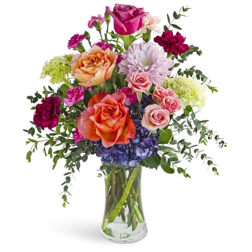 Prismatic Harmony is a vibrant mix of roses, hydrangeas, carnations, and premium foliage designed to brighten any room. This colorful arrangement is a perfect choice for flower delivery when you want to celebrate a birthday, send encouragement, or surprise someone special. As your trusted local florist, we may substitute blooms based on availability while keeping the overall look and feel true to the design.