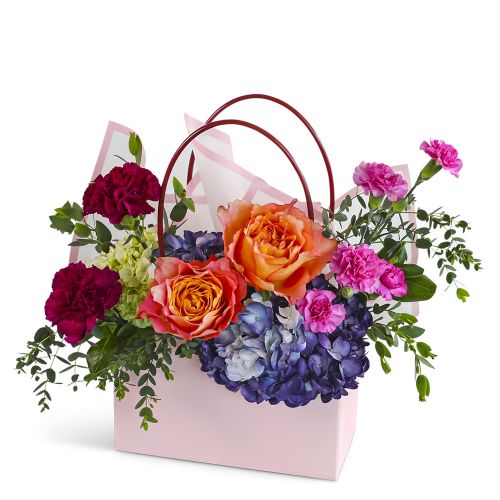 Prismatic Tote features roses, carnations, hydrangea, and premium foliage arranged in a modern handled tote. The vibrant mix is designed to brighten their day, making it a perfect choice for birthday flower delivery or a cheerful surprise from your local florist. Flower varieties and colors may vary slightly based on availability while the overall style and feel remain true to the design.