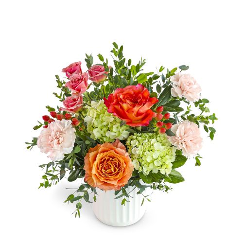 Sunshine Mama brings together peach roses, carnations, hydrangea, and hypericum berries with premium foliage in a classic white vase. It’s a cheerful choice for Mother’s Day flower delivery and a sweet way to celebrate everything Mom does. Blooms and shades may vary slightly based on what’s freshest in the shop, but the overall color palette and style will stay consistent.